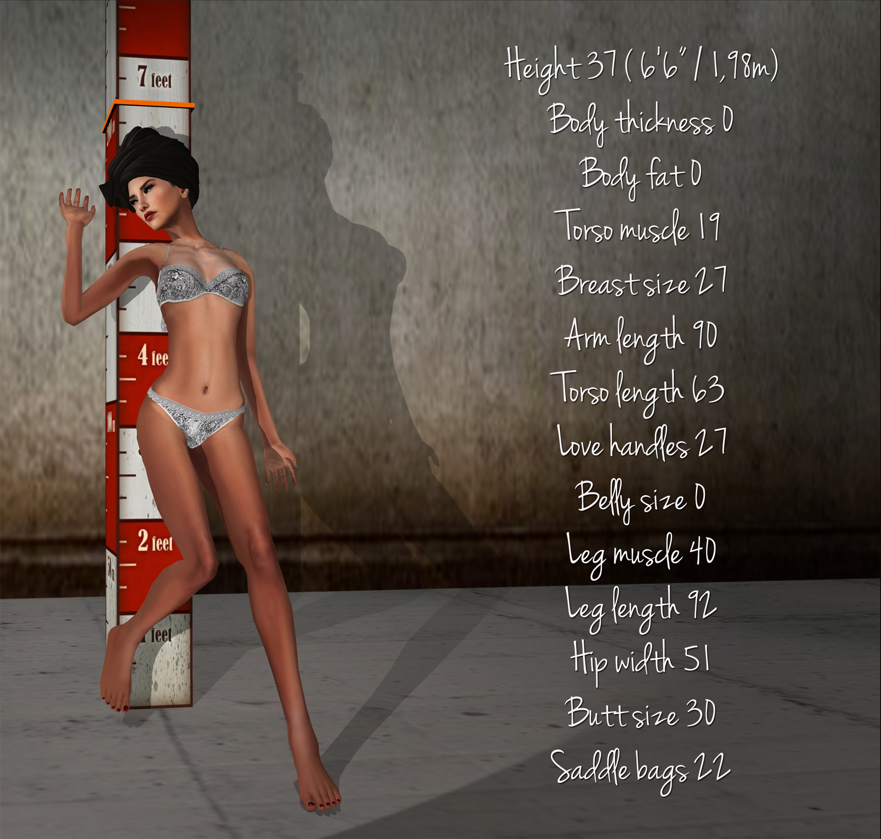 Thankfully I don’t have to change much to fit into mesh – though the sizes I wear change a lot! Depending on the designer, I wear xxs – s. What I do have to change from time to time is breast and butt size – a few digits up or down, depending on the fit of the clothes, I do that gladly. What I don’t like though is that I have to change my legs constantly – my avi is bow-legged, and that doesn’t go well with rigged mesh boots or feet, with boots the leg is pushing through the boot or there’s a gap between the leg and the seam of the mesh feet. As my bow-legginess is what I’m most peculiar about :-P, you can probably imagine how much changing that digit irks me!