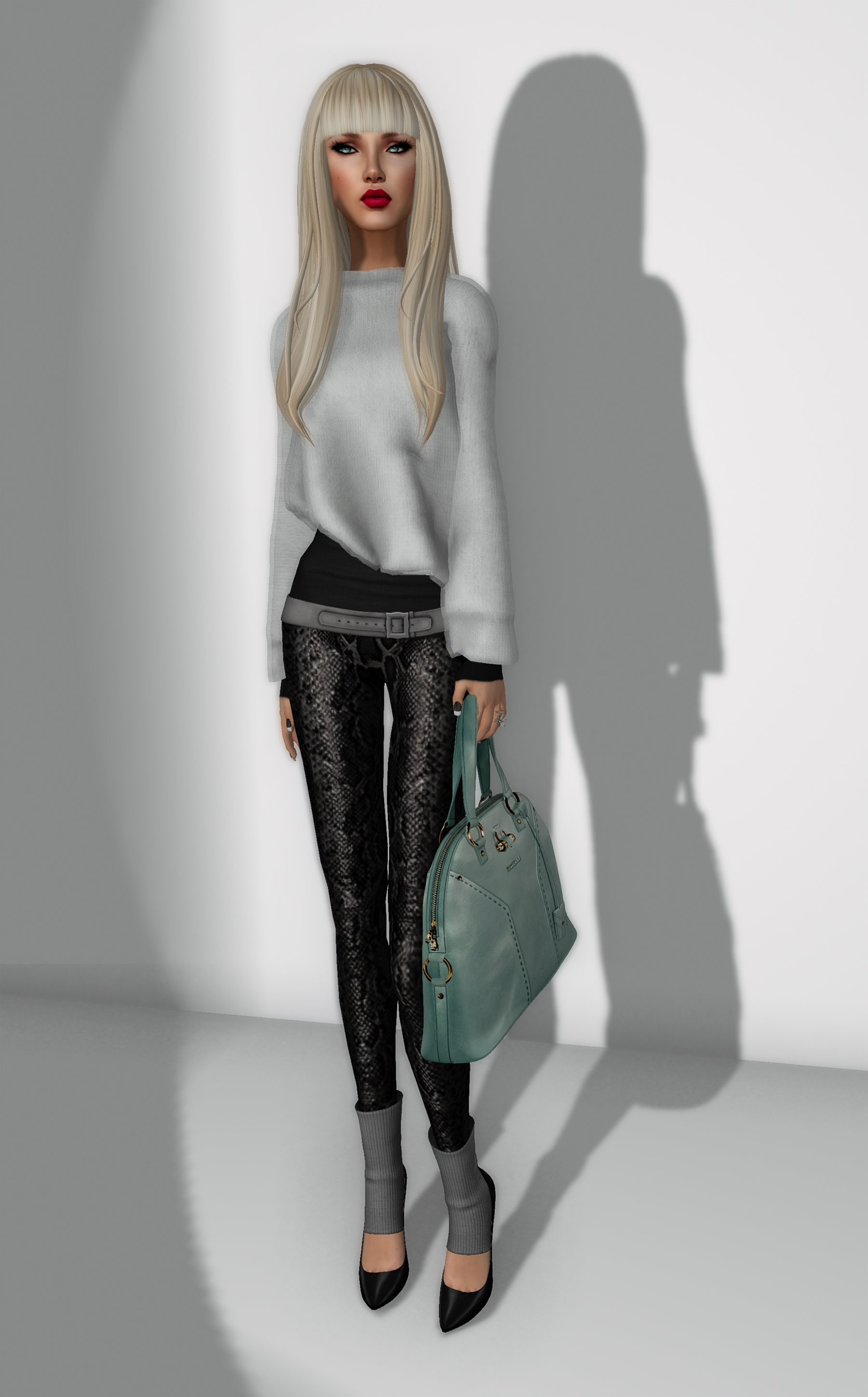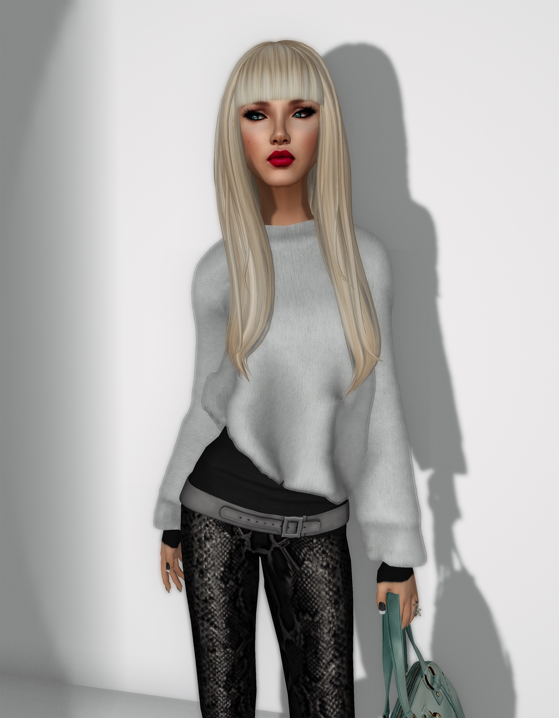 Love mixing the edgy snakeskin leggings from ISON with the cozy angora knit from u.f.o, and the bag complimenting my eyes… plus the straight fringe of the hairstyle by LaViere, who is fast becoming one of my fav hairdesigners!