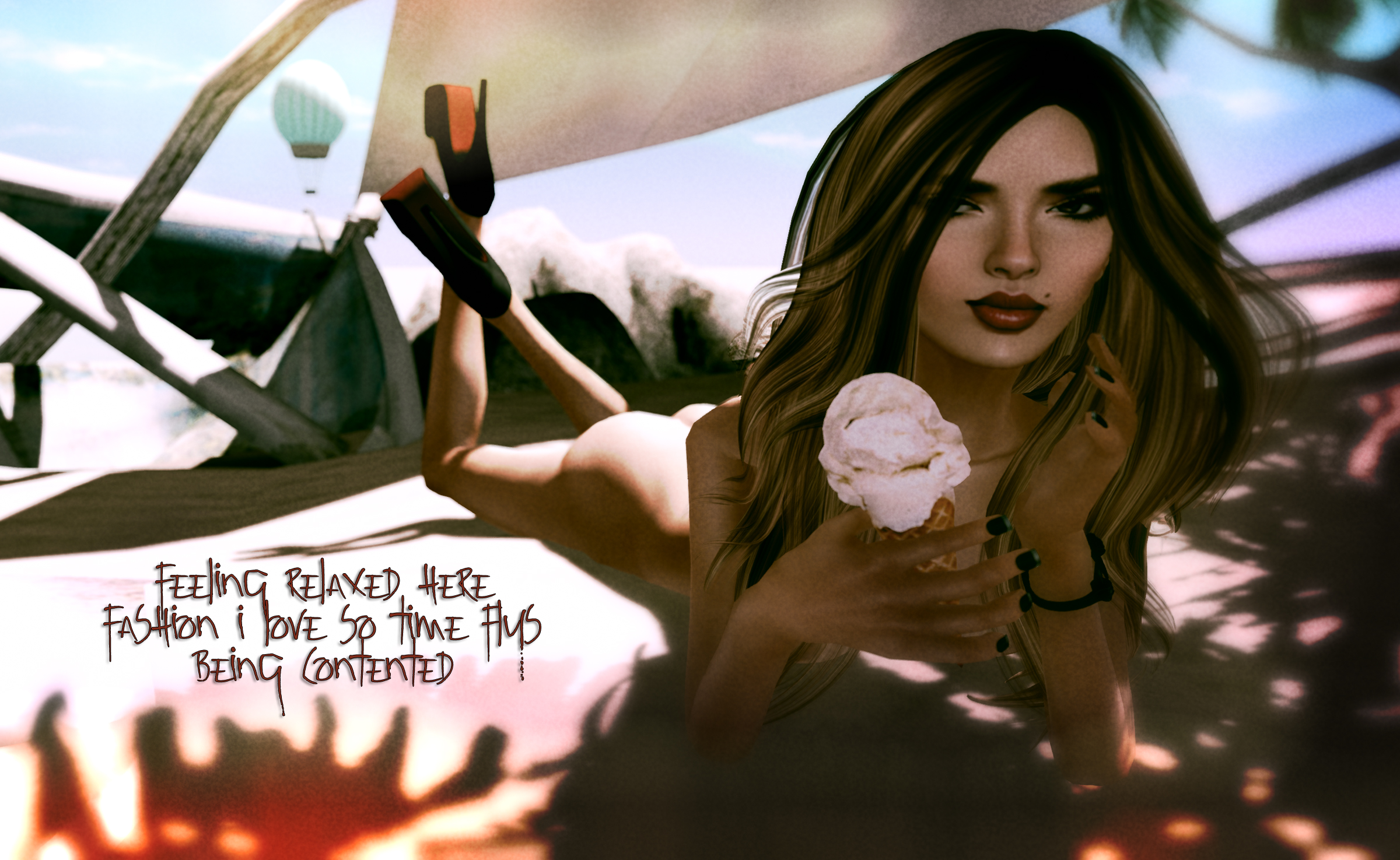The picture was taken on my land, using one a pose from Embody’s new pose prop pack F I SCREAM, and the balloon just came by in time to be featured …. ๐