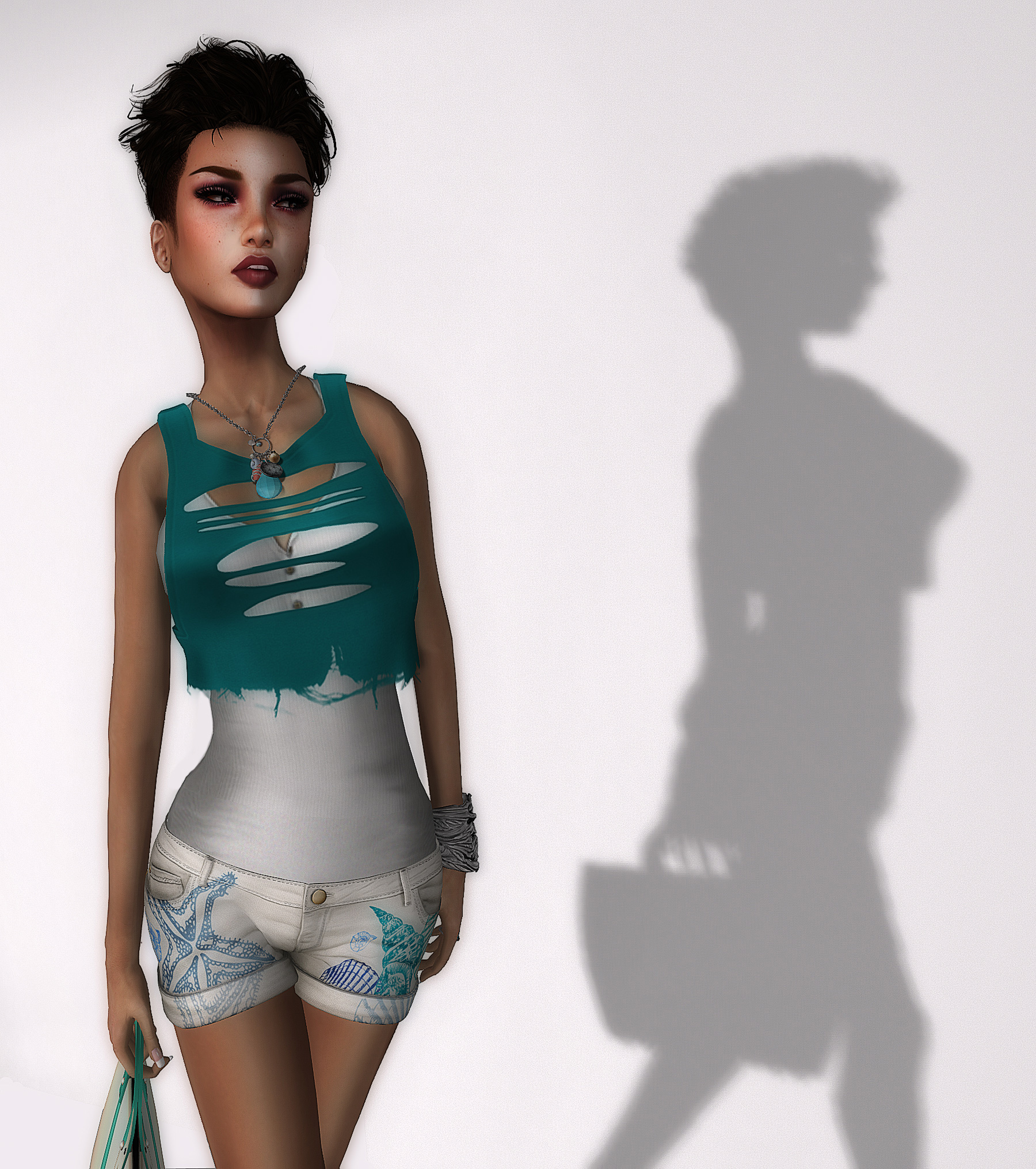 It’s still not really summer here – 15 C for the last few days – so I’ll wear summer clothes in SL! ๐ I love the new shorts by erratic! Grabbed the bag and torn overshirt at SL Fashion Week, and the sexy slingbacks from Belgravia are Slink addons. I can’t wait to see more of the Whisper skin by Essences! And the boy haircut is from Dura, my fav place to go to for short hairstyles.