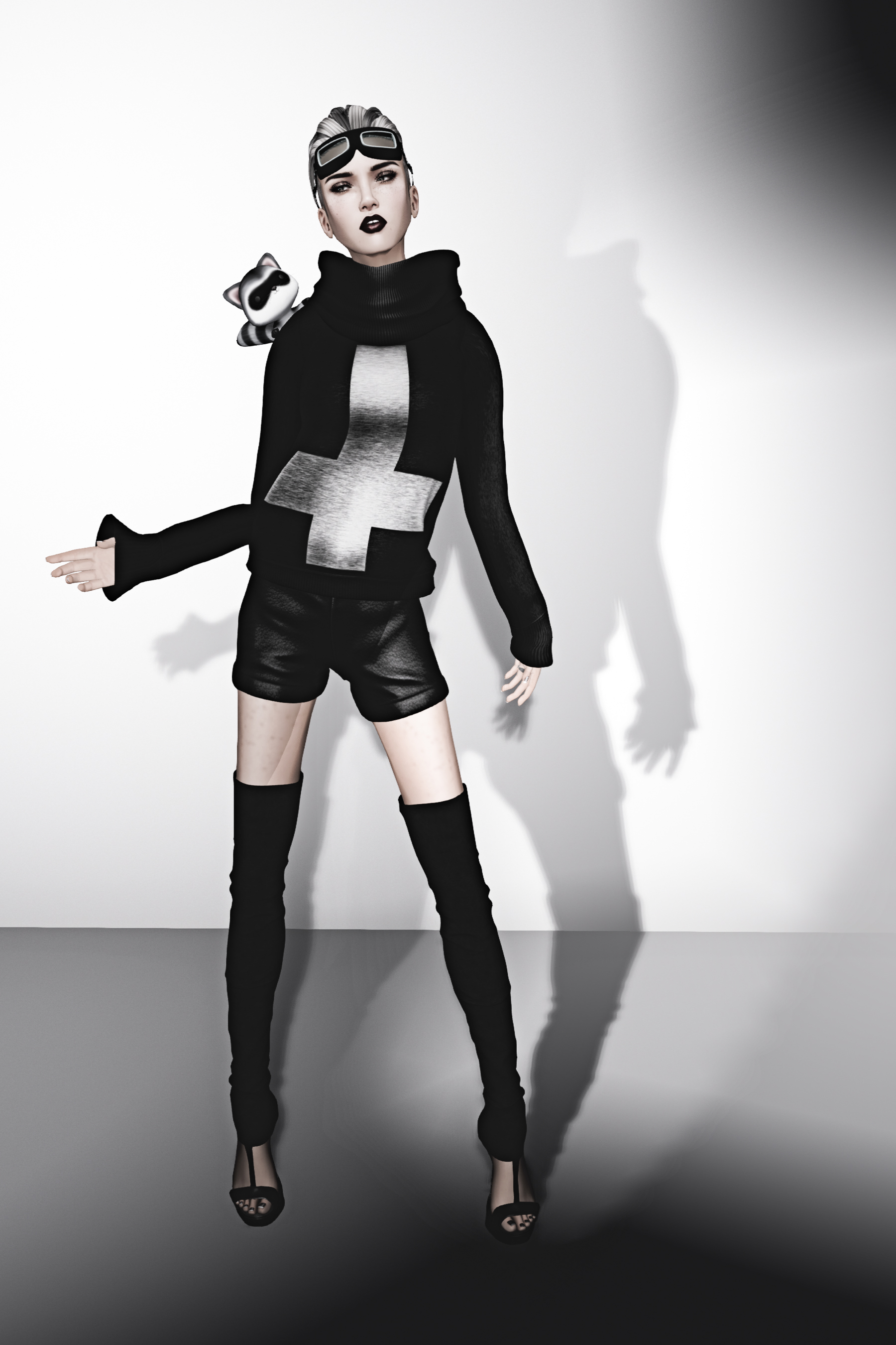 I love cowl neck sweaters, not only in SL, but in RL, too! So I had to have this one by [AUX], because in addition to the cowl, it has loooong sleeves, too! That’s a win-win! I do think we make sexy thieves, the racoon and I… of course, the lovely boots/sandals by Hucci definitely help, and the leather shorts complete this outfit nicely. Love the goggles by 22769, and the skin I’m wearing is from a new to me store – Birdy! As you might know, I love strong brows, and Lana has that, plus a lovely chiselled face which I like very much!