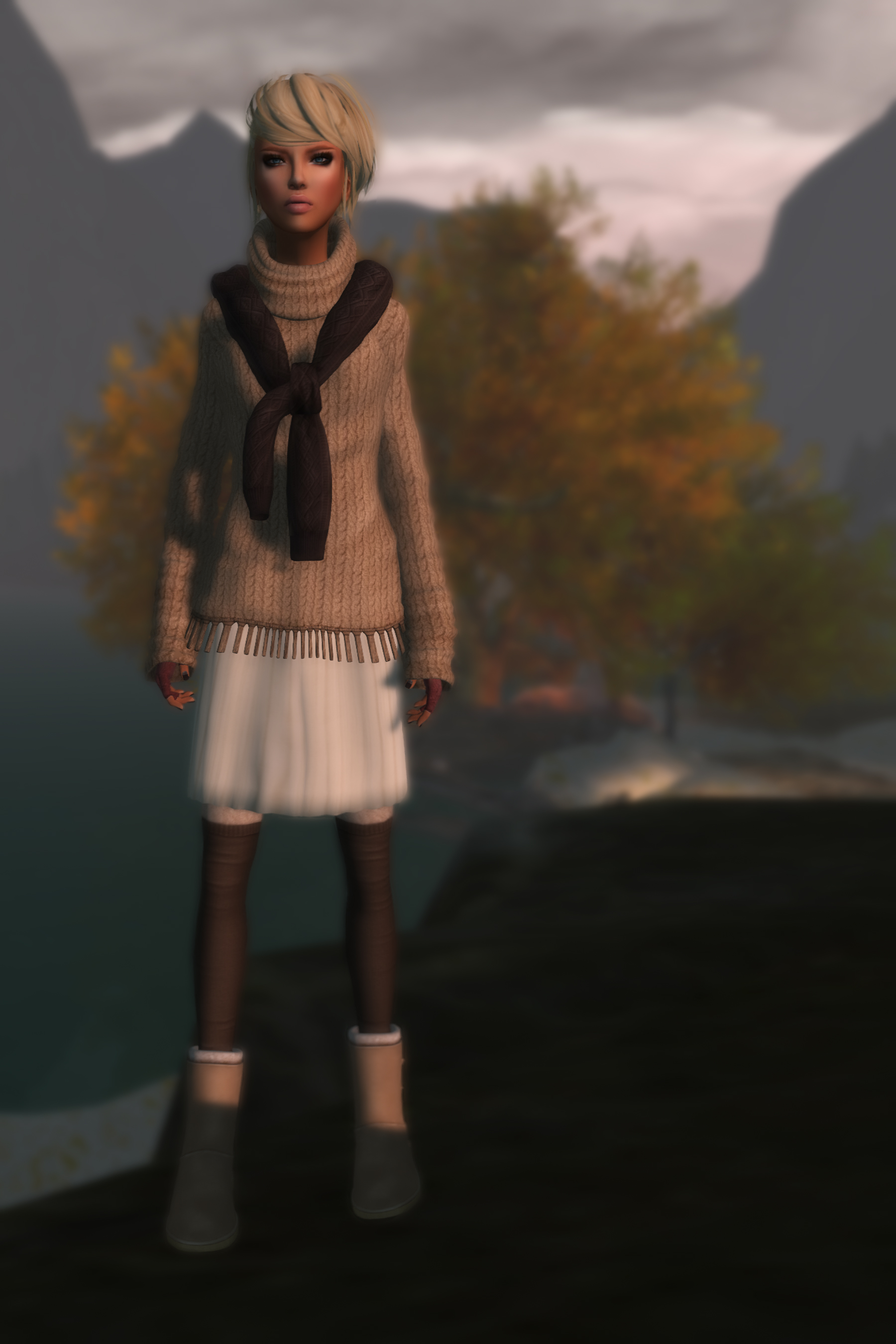 I’m so so so in love with this sweater! It’s from a new-to-me store, ::K::, and the package comes with both boy and girl versions! It’s exactly the kind of sweater I would love and wear to death in RL, too – looong sleeves, lose fit and a huge cowl, just perfect. My hair is from [INK], to be found at the Chapter Four, as are my boots from COCO, which are a gatcha item. I feel well protected from the cold wind!