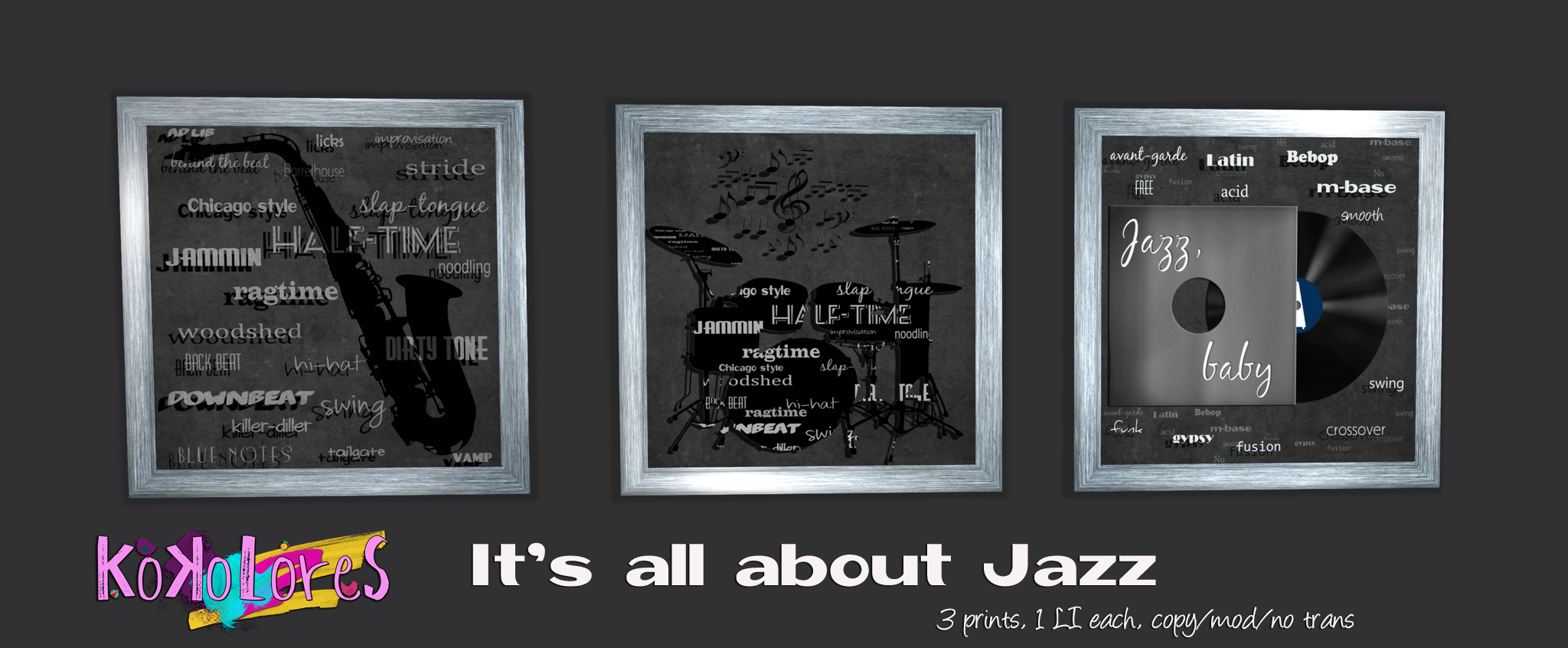Rhapsody is a music themed event, and KoKoLoReS offers you hair, poses and wall art inspired by Jazz! It’s a bit of a journey through the ages, starting with the Flapper Girl hairstyle in the 1920’s, The Jazz Singer pays hommage to the great singing Diva’s of the 1950’s, and Jesse nods its head into the direction of the Nu Jazz szene.