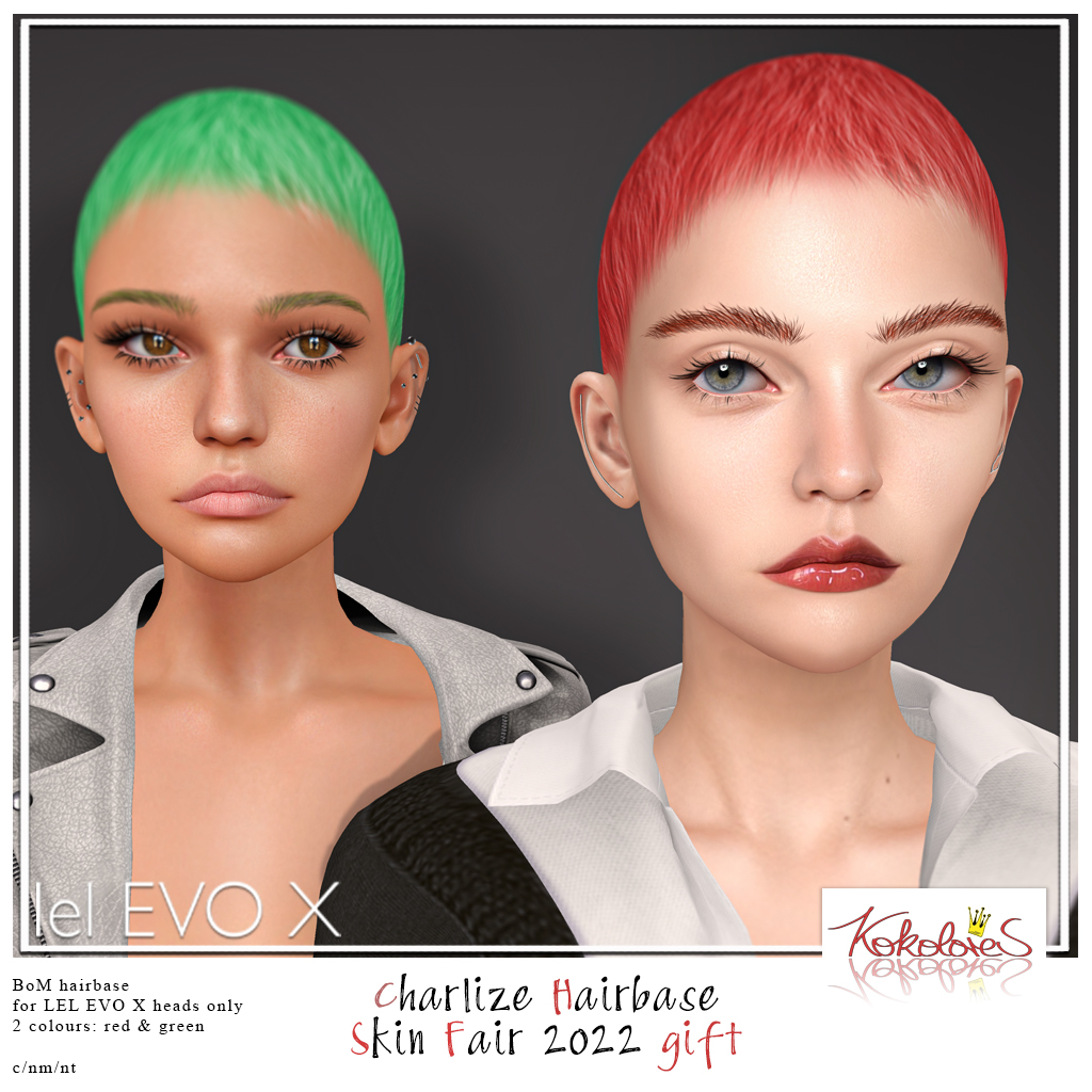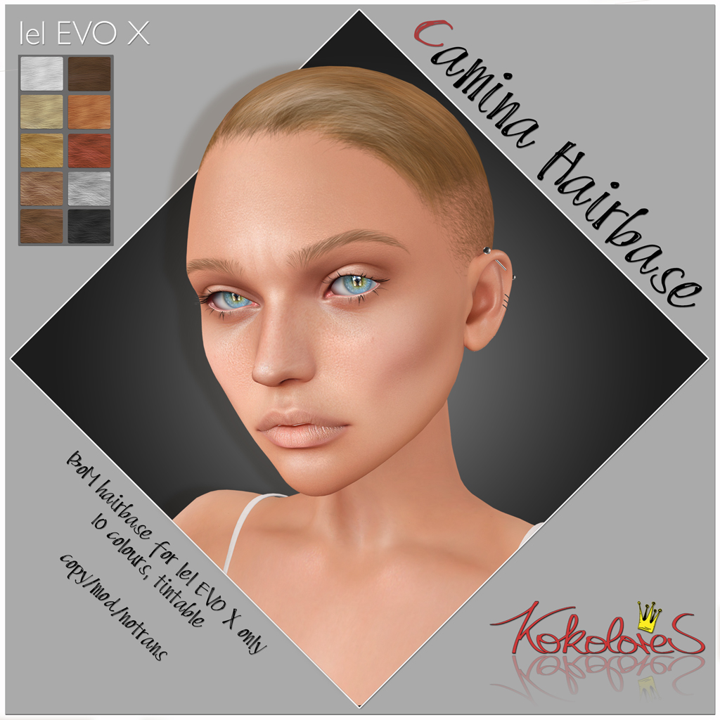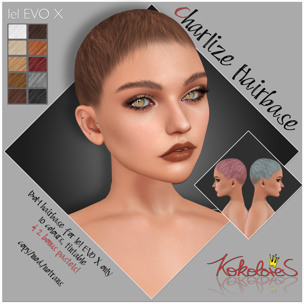 This year, I've prepared 4 Lel EVO X hairbases for you, all of them short: say hello to Dana, Camina, Charlize and Leyla! All of them come in 10 colour options and are tintable. Charlize has 2 bonus pastel colours! Even though they have girl names, they fit male Lel EVO X heads quite nicely, too. Go grab the demos!