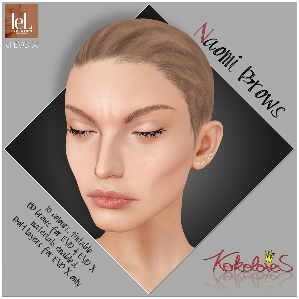 I also made 4 different brow styles: Babs, Clarissa, Cara and Naomi. All of them come as BoM layers for Lel EVO X heads only, and as HD versions with materials for Lel EVO and Lel EVO X heads. From slim and sleek to wild, bushy and unruly, there's a brow for every style. Demos for all hairbases and brows are out at the fair and in the notices of the Juniper Events group, as well as at the KoKoLoReS mainstore.